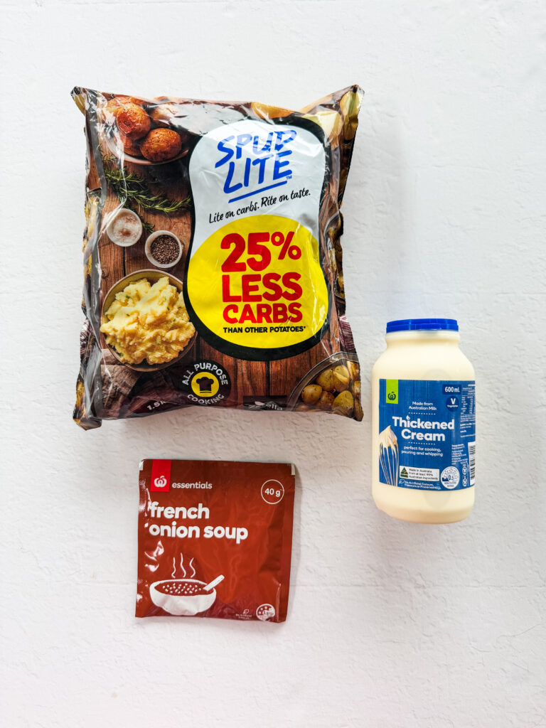 This easy 3 ingredient potato bake uses potatoes, cream, and French onion soup mix. No cheese, budget-friendly, creamy and perfect as a simple side dish.