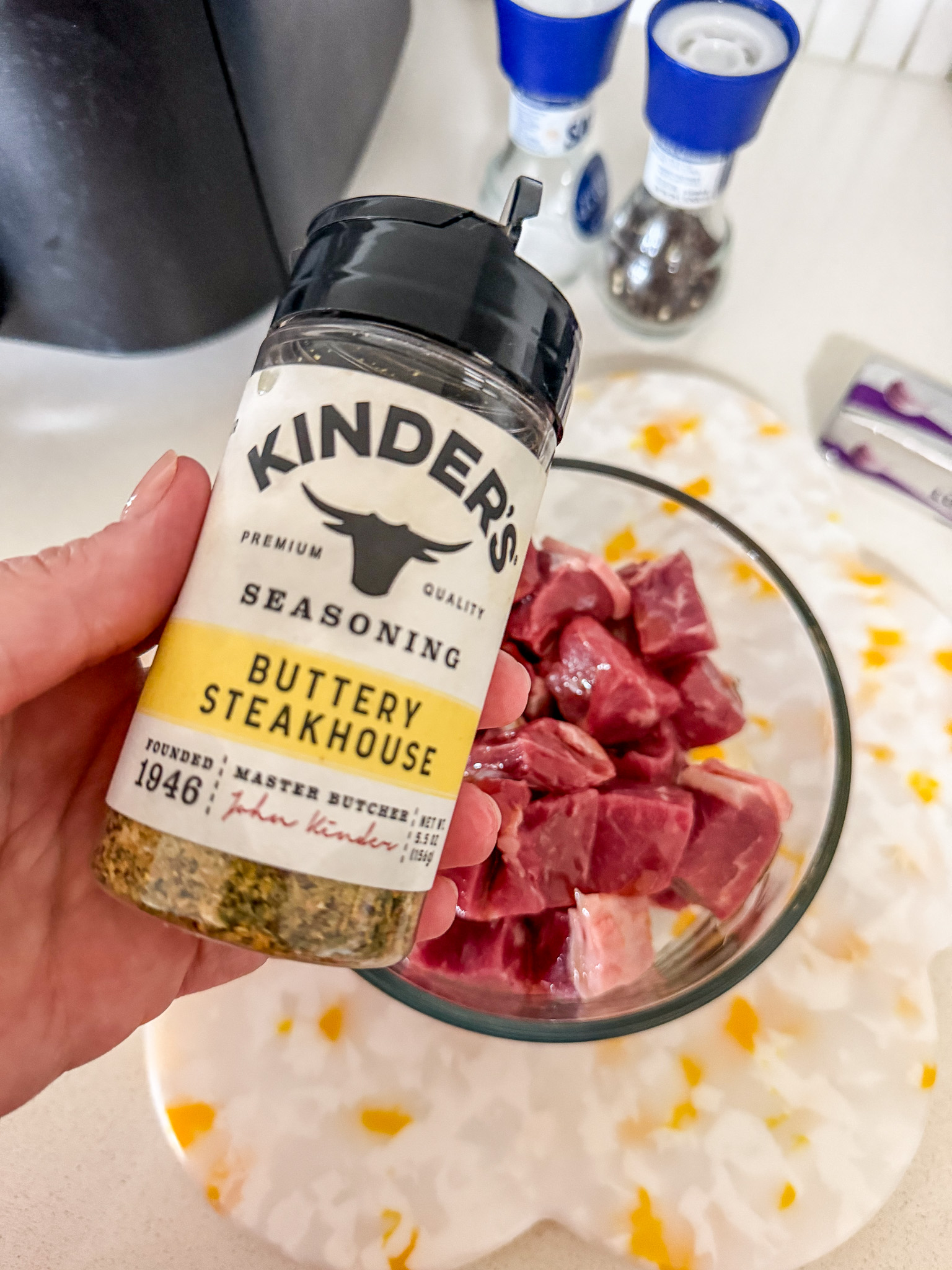 Add your seasoning, salt and pepper, then toss everything together until the steak is evenly coated.