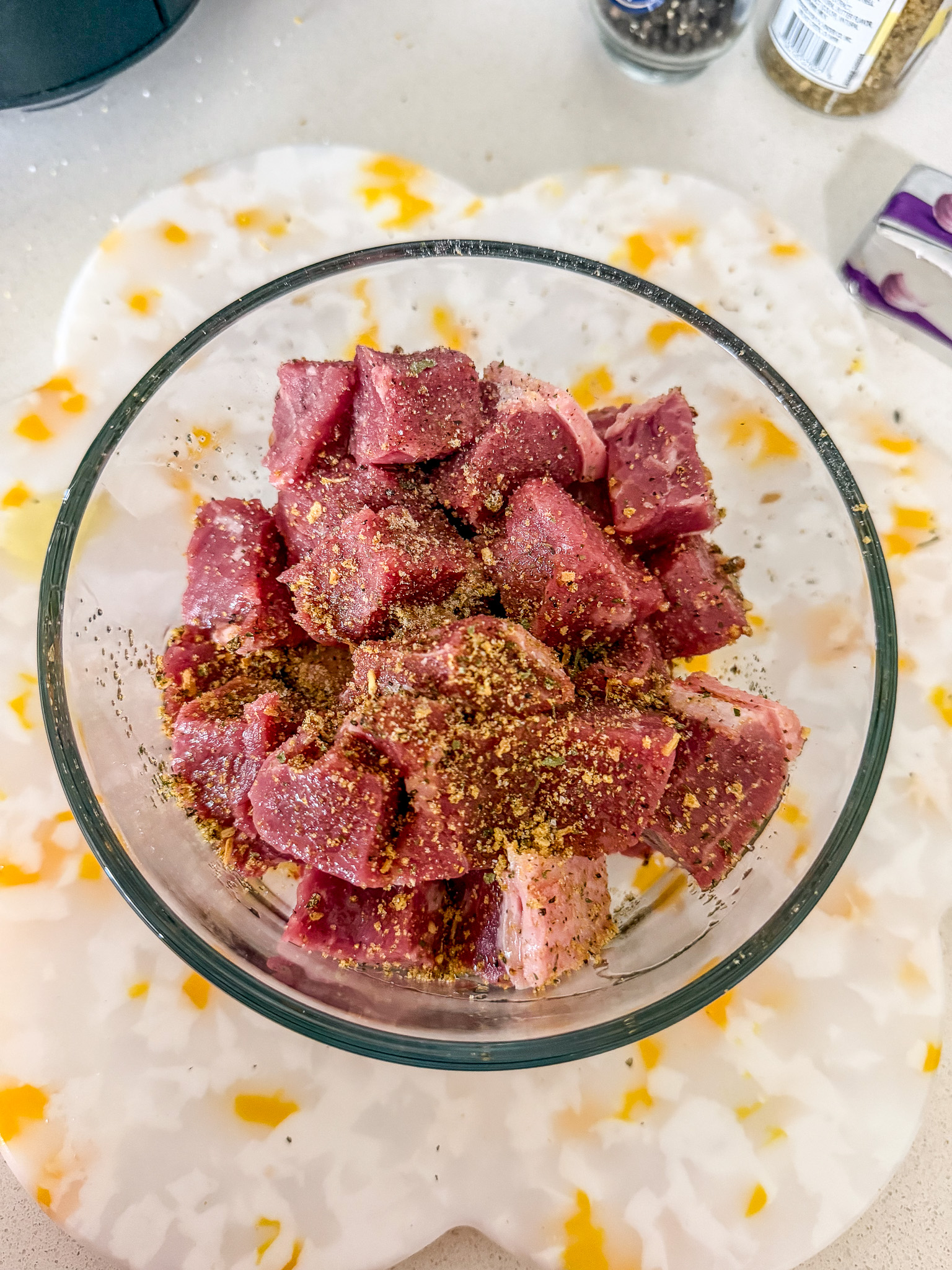 Place the steak cubes into a bowl and drizzle with olive oil.