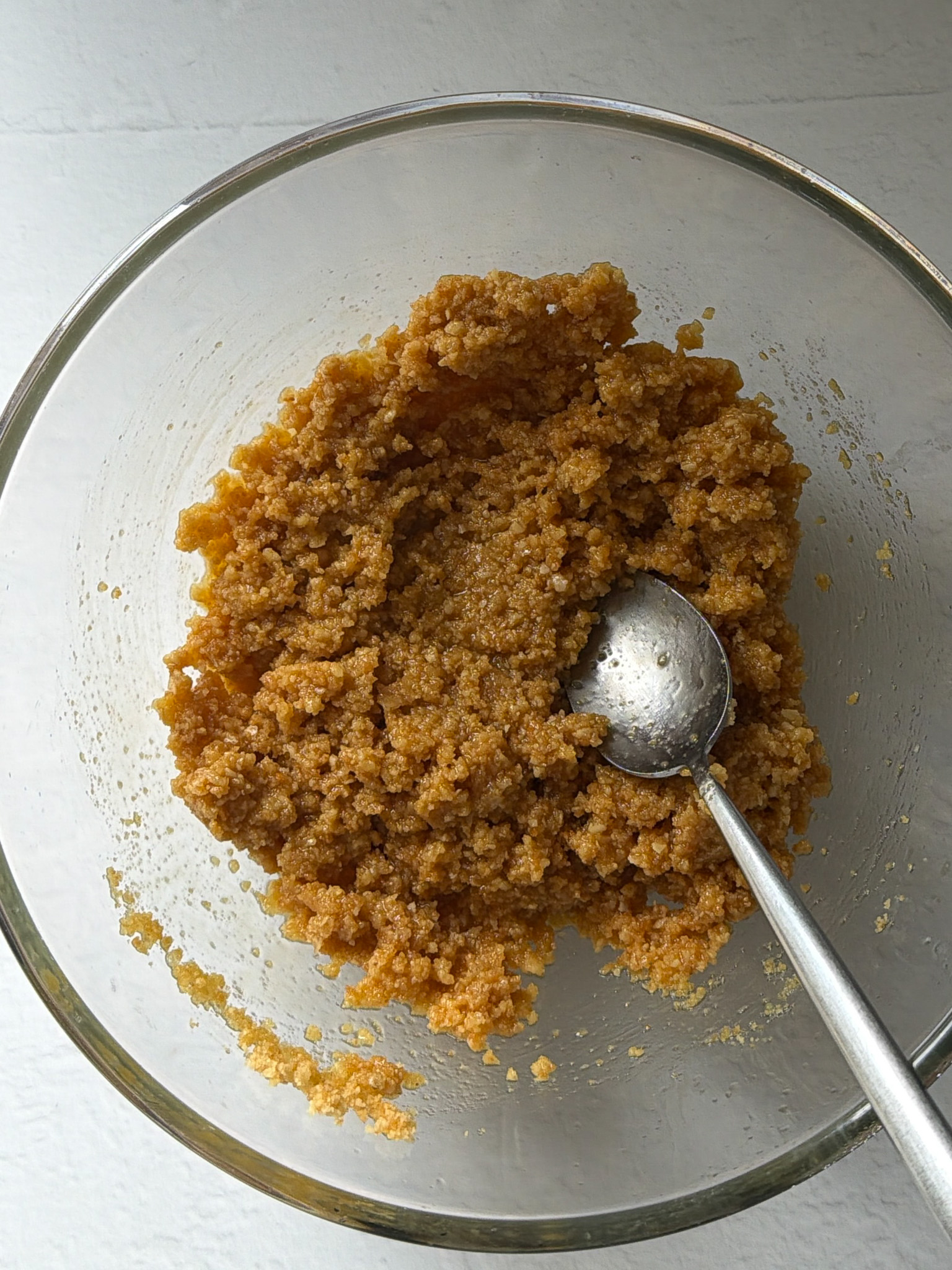 - Blitz biscuits into fine crumbs and mix with melted butter.