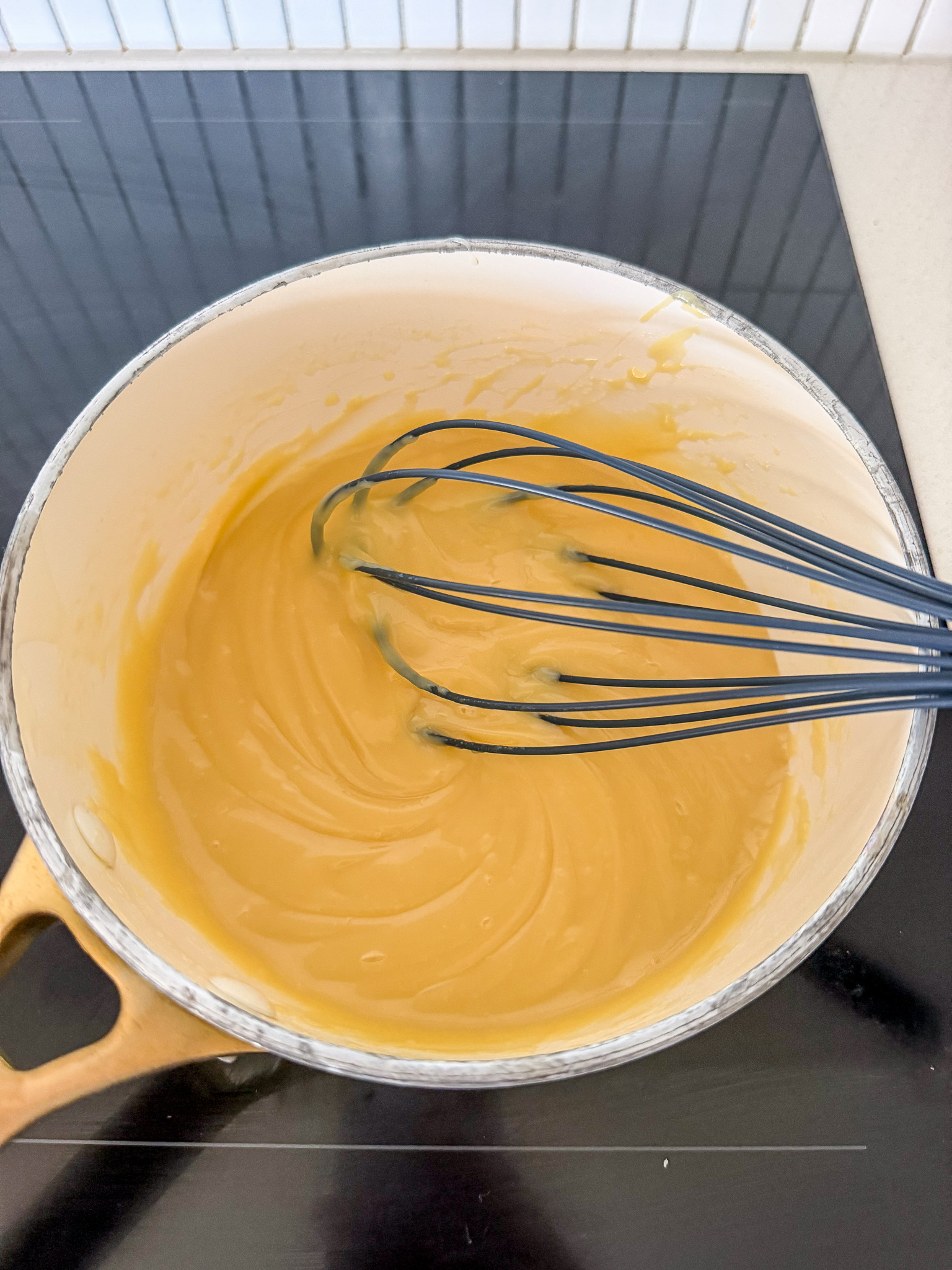 Stir continuously until everything is melted, smooth, and gently bubbling.