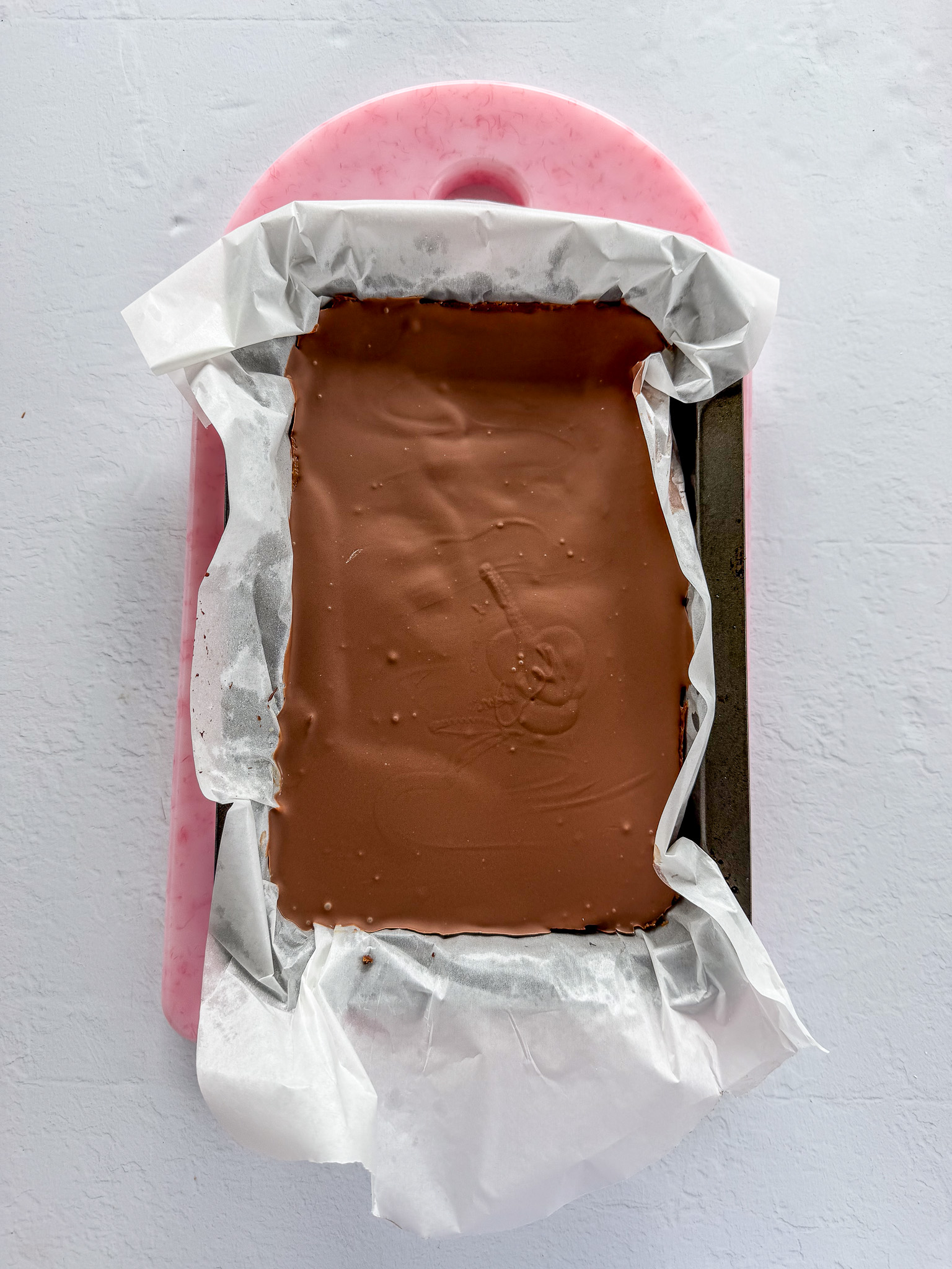 Pour the melted chocolate over the caramel layer and spread evenly.