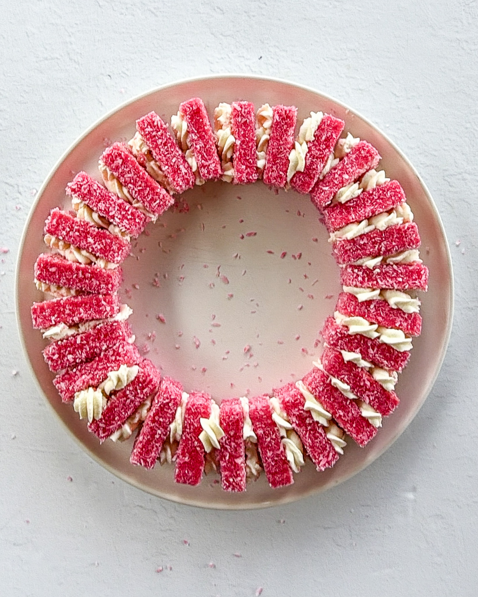 Using a piping bag or spoon, add cream to one side of each lamington finger. Place the lamingtons on their side, working in a circle, placing them close together until you form a wreath shape.