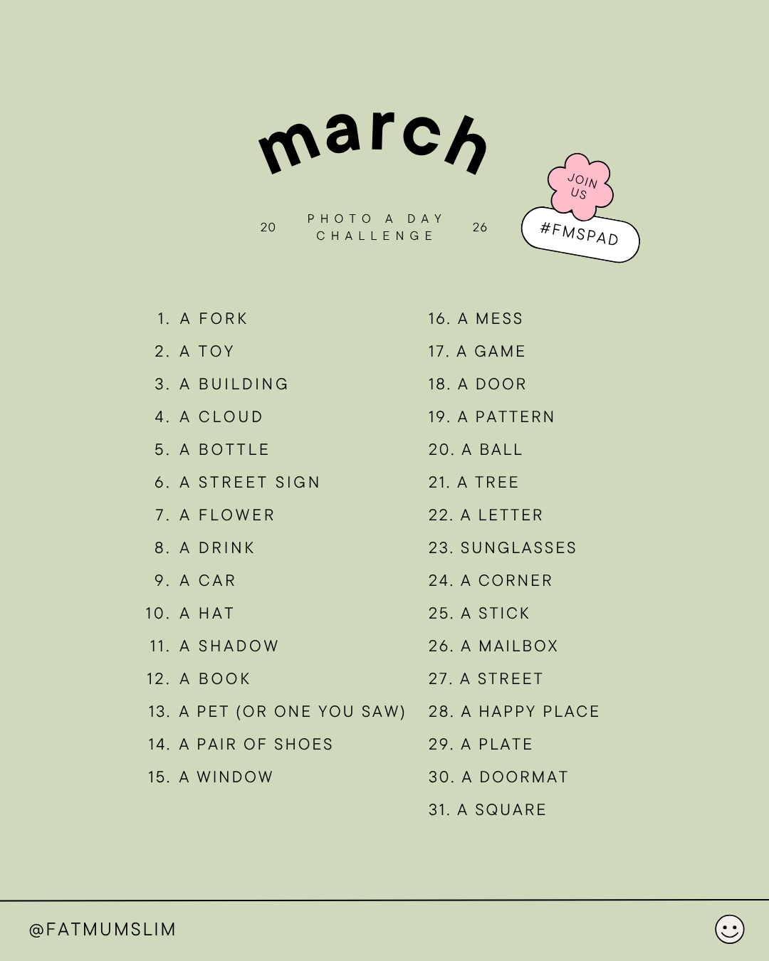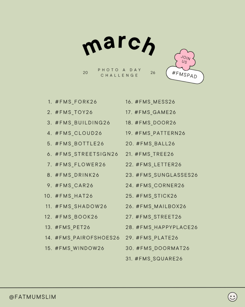 📷 Take a photo using the prompt as inspiration. For example, if the prompt is ‘A FORK’ so start the month and share a photo of a fork! Easy.