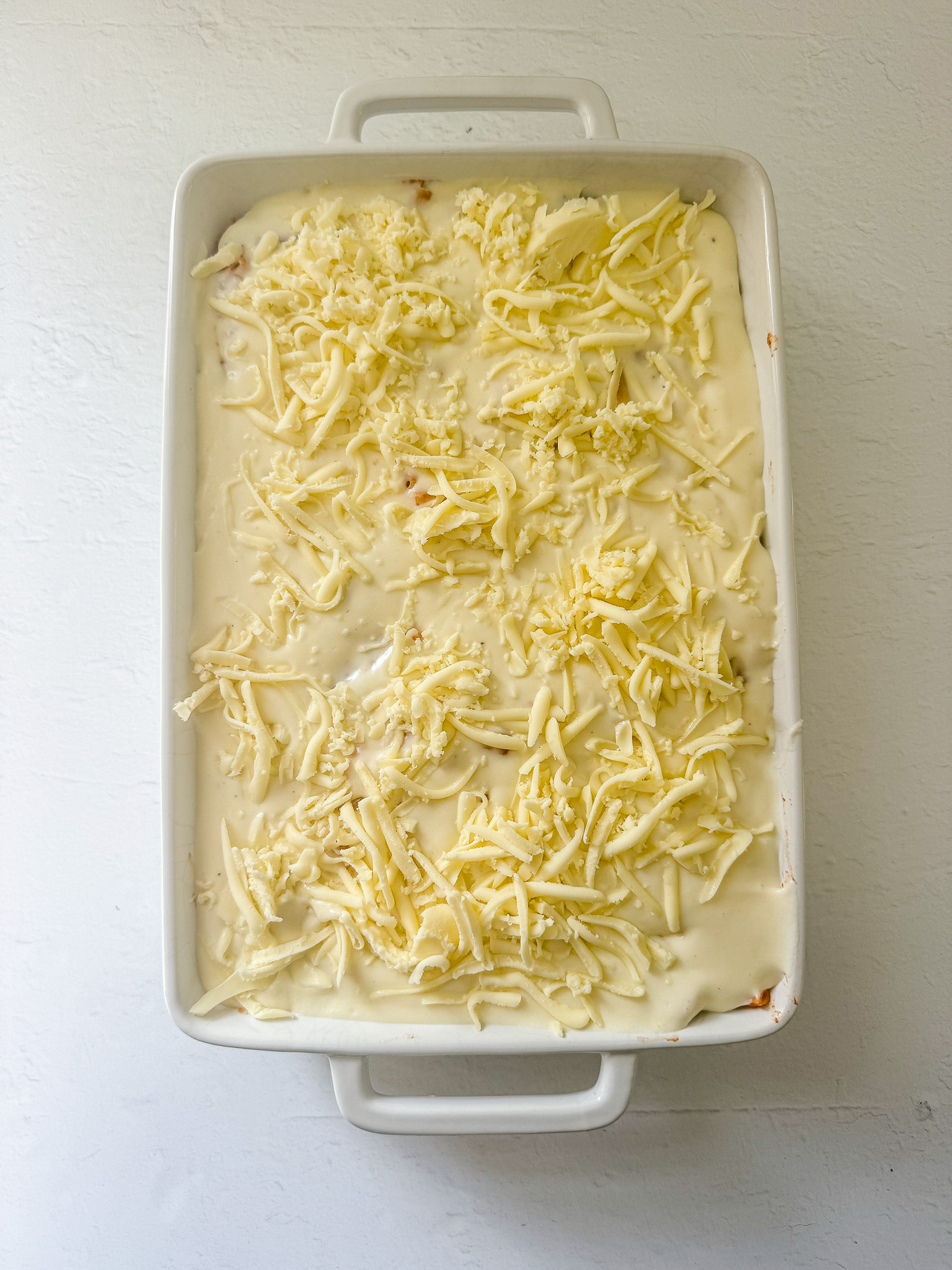 Pour the cheese sauce over the pasta mixture and spread evenly.