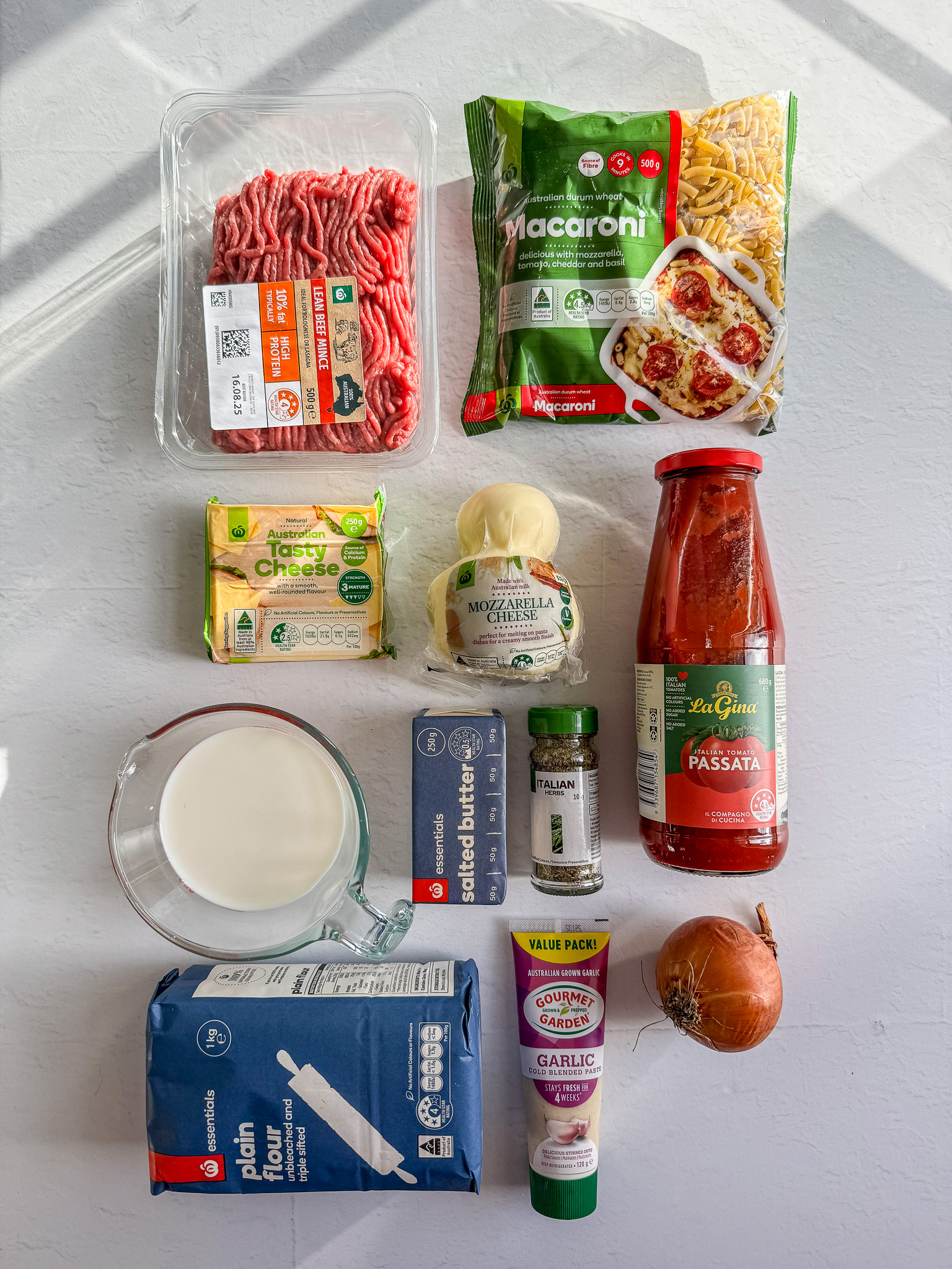 - In a large pan, cook the onion and garlic until softened. Add the beef mince and cook until browned. Stir in the passata, ½ cup water and Italian herbs, then simmer for 20 minutes until slightly thickened.