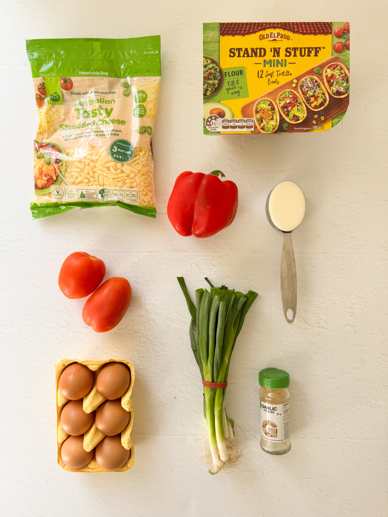 - Place your fillings into the taco boats. We did capsicum, tomato, spring onion, cheese and bacon.